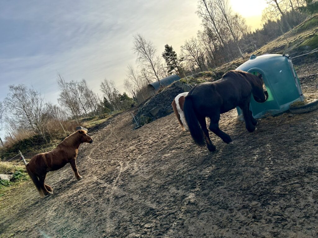 - Fri tillgång vintertid av kvalitetshösilage med lågt sockerinnehåll som serveras med två slowfeeding-nät över i balkupor för att gynna hästarnas tuggtid utan att de får i sig för mycket och balarna hålls fräsha. Vi sköter fodringar.